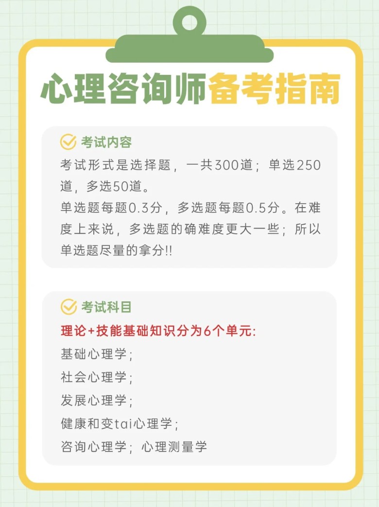 心理咨询师👩🏻⚕️ | 一个自由高薪职业!!心理咨询师考了有什么用???✅提高职场情商✅调节自身负面情绪,提升心理素质✅轻松处理社会人际关系✅轻松处理家庭/子女关系✅有机会从事一份时间自由待遇不错的职业(心理咨询师人才稀缺,工作时间自由,还能发展副业)中科院:心理咨询师证书,一年3次考试,分别是5月,8月和11月,由中国科学院心理所组织考试和颁发证书,全国认可与统一,行内含金量高! !!⚠️需要注意的是,那些协会证书,地方证书都不要考!没有含金量,不能从事相关工作,考了没有用的!.2⃣心理咨询师报名条件🔸年龄要求:年满21周岁🔸学历要求:大专及以上学历,在校生亦可,但需在校最后一年,可开具在校证明.3⃣心理咨询师报名材料身份证正反面照片 、一寸白底照片 、报名表 、学历证明.4⃣心理咨询师考试内容心理咨询师只考两科:理论知识和操作技能🔸理论知识:基础心理学、社会心理学、发展心理学、人格心理学、变态心理学与健康心理学、心理咨询概论🔸操作技能:心理咨询技能、心理测验技能、心理诊断技能和心理咨询专业伦理⭕️⭕️考试采取百分制,也就是说满分100分,60分为及格。考试题型为250道单选题和50道多选题,单选题每题0.3分,共计75分;多选题每题0.5分,共计25分。.5⃣心理咨询师避坑指南❌不限条件随便报(需要满足条件才可以考)❌考试包通过,有内部通道直出证书(考试都是需要参加考试,成绩合格才可以拿证)❌拿证包就业,挂靠(包就业不可能,挂靠违法) ❌拿证可以领补贴(心理咨询师证书不能领补贴,已经取消).6⃣心理咨询师机构挑选指南1、有无办学资质和正规备案2、报名是否签合同,开发票,对公缴费3、是否为一次收费,没有其他隐性费用4、网课、教材、题库是否齐全.✅都是干货,希望想考心理咨询师的姐妹们可以认真看完,不踩坑一次上岸啦!昆山才思教育江江老师19941905958玉山城北九方城市花园九栋三楼