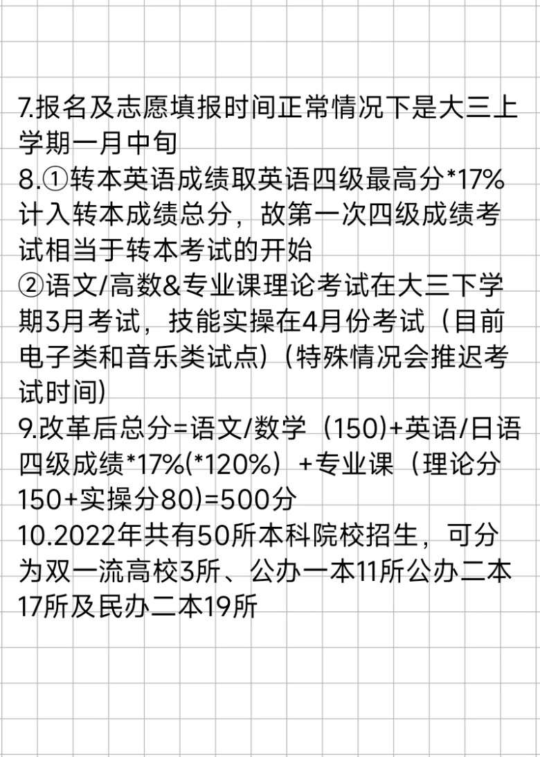 25年江苏专转本:不懂这些,劝你别考了❗🔔专转本,主要分为:三年制专转本与五年制专转本,是专科大三学生报考“全日制本科”的机会😊💥如果你不了解【专转本】报考攻略😭👇建议查收以下内容:.📍三年制专转本1.报考时间:25年报名时间在1月份,考试时间在3月份;2.报考条件:①修完学校教育教学计划规定内容,达到毕业要求,能正常毕业;②取得全国计算机等级考试一级及以上证书。3.考试科目:⭕文科:①大学语文150分;②外语120分;③专业课(理论150/实操80)⭕理科:①高等数学150分;②外语120分;③专业课(理论150/实操80)⭐外语可以选择英语四级或大学日语成绩✅大学英语四级成绩*17% 一年两次考试机会(6月/12月)✅大学日语四级成绩*120%。.📍五年制专转本1.报考时间:25年报名时间在1月份,考试时间在3月份;2.报考条件:①所学专业符合接收高校专业的要求;②修完学校教育教学计划规定内容,达到毕业要求,能正常毕业。3.五年制专转:⭕非师范类:英语100-专业课一100-专业课二100,三门课满分300;⭕师范类:①美术学/音乐学/体育教育专业考试科目:大学语文、大学英语、教育学心理学基本原理三门;②学前教育考试科目:大学语文、大学英语、幼儿教育学心理学基本原理三门。③学前教育、美术学、音乐学专业的考生还须参加江苏第二师范学院盐城师范学院、常州工学院和泰州学院4所院校联合统一组织的专业加试。.综上,当你了解了这些信息,就可以规划专转本备考攻略了。更多江苏专转本问题,欢迎交流~昆山才思教育江江老师19941905958玉山城北九方城市花园九栋三楼