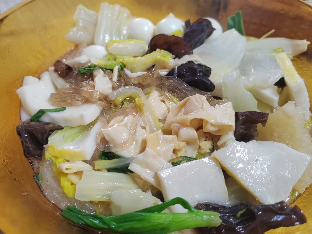 放了肉皮,鹌鹑蛋,薄百叶,黑木耳,荆门鱼糕,白菜和红薯粉丝。本来要弄蛋饺的,感觉吃不完就没放。最终确实没吃完,这会还有一大半呢
