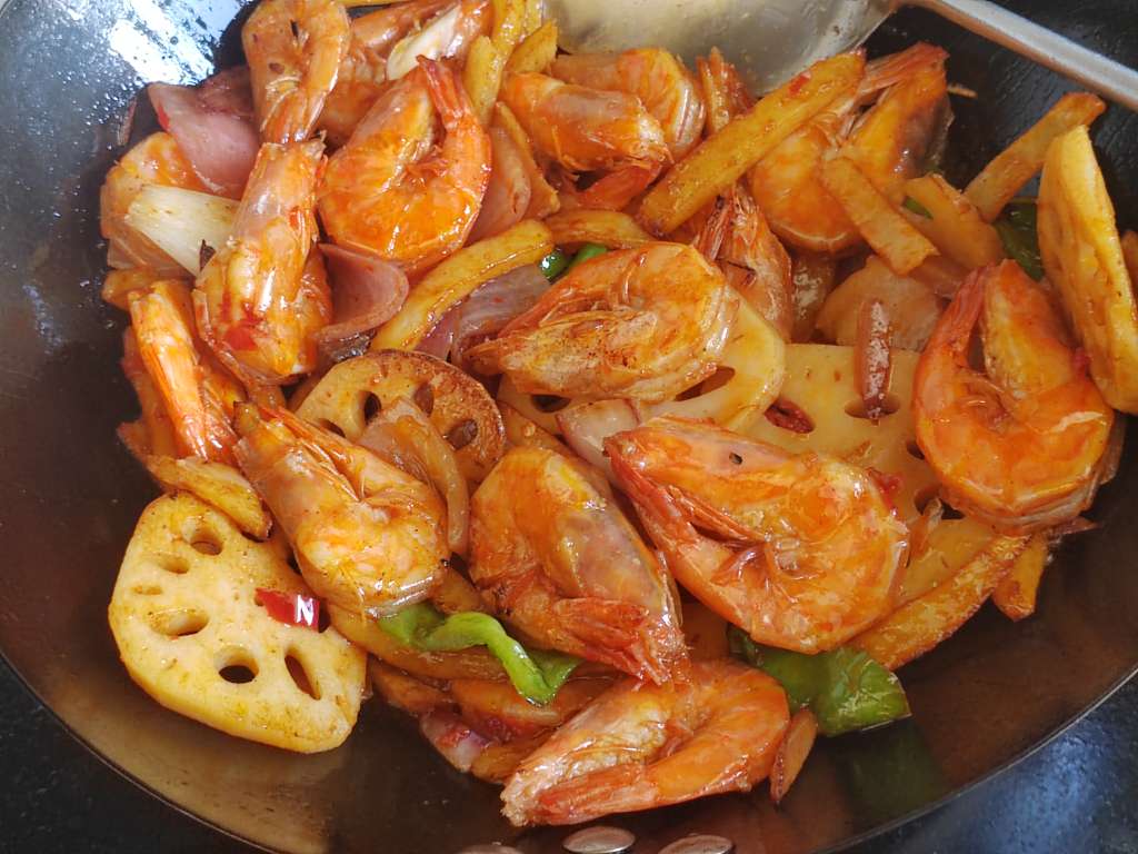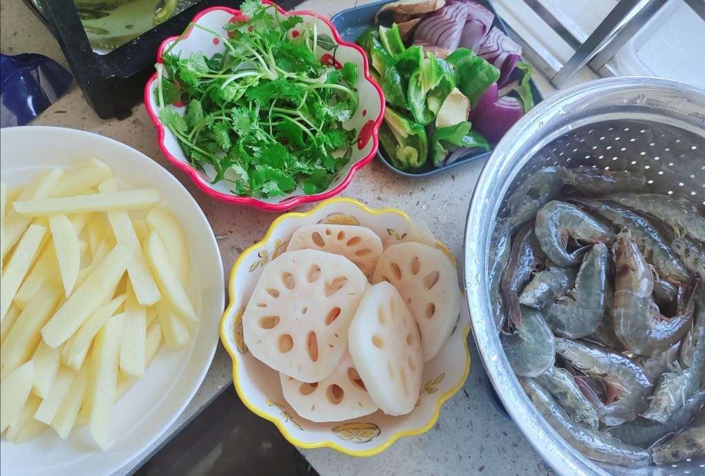 盒马的基围虾个大也均匀,还买了脆藕和土豆,放点青椒洋葱生姜,他6年前开始不能吃海鲜,不然放点鱿鱼,干锅鱿鱼虾会很好吃
