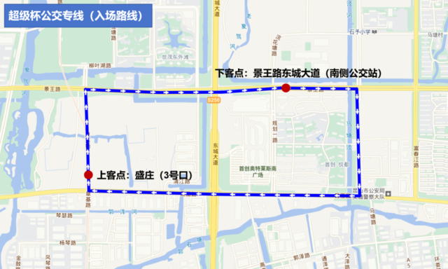 自盛庄站3号口(轨道盛庄站东侧公交站)发车,沿夏东街、景王路直达景王路东城大道南侧公交站。