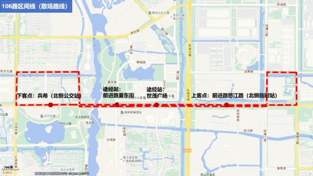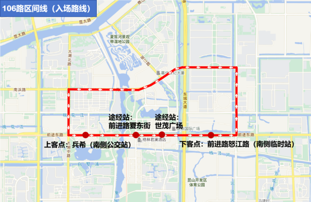 自兵希南侧公交站发车,沿前进路停靠前进路夏东街、世茂广场,至终点奥体中心北(前进路怒江路以西临时公交站)。