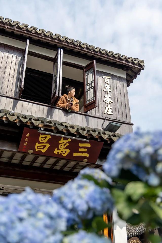 古镇照壁前绣球花盛开,入画当一日油画少女;双桥边梅花限定皮肤上线,拍一拍江南版的"只此青绿"。