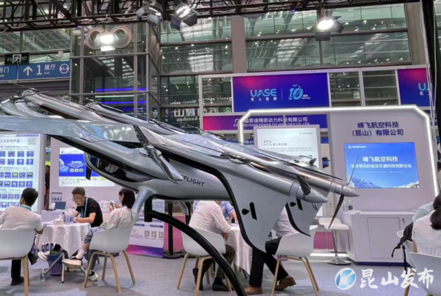 位于淀山湖镇的峰飞航空科技(昆山)有限公司此次参展带来了研发和适航进度全球领先的eVTOL飞行器盛世龙的1:5缩比例模型。据悉,eVTOL载人航空器盛世龙,可搭载5人(1名飞行安全员+4名乘客),巡航速度最高200公里每小时。