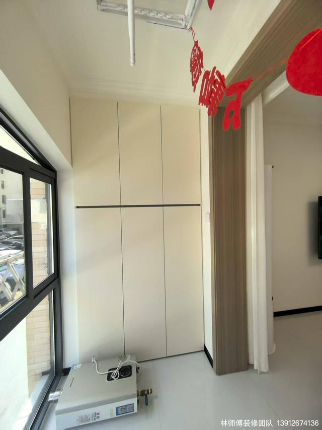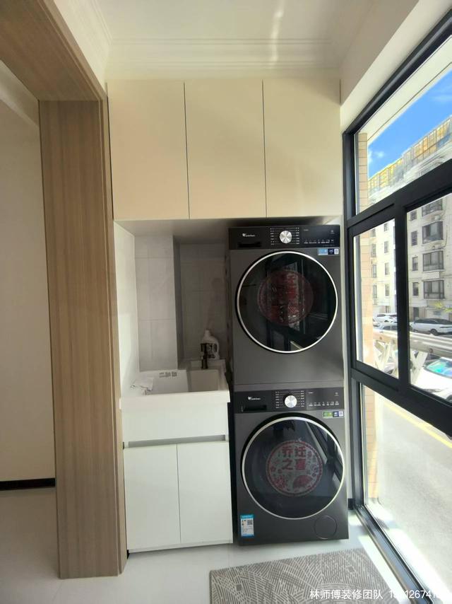 阳台的一侧做了洗烘机叠放,节省了地面空间,洗衣烘干一步到位,非常方便。另一侧定制了橱柜,用来收纳清洁用品、行李箱等杂物,让阳台保持整洁。