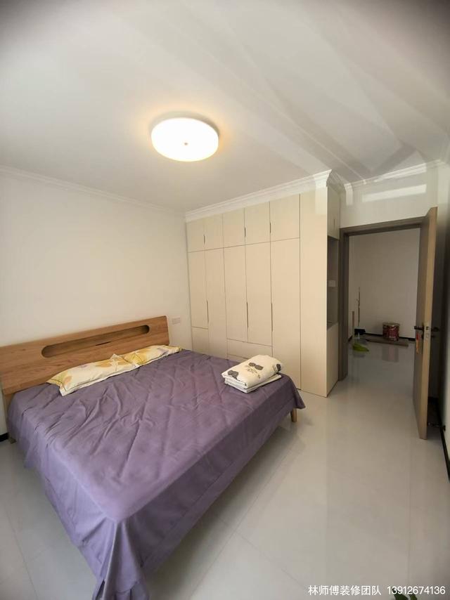 主卧走简约路线,一面墙的衣柜提供了充足的收纳空间,换季的衣物、被褥都能轻松收纳。顶部装了一盏简约的吸顶灯,光线均匀不刺眼。搭配一张实木床,简洁大方,躺在上面特别安稳。