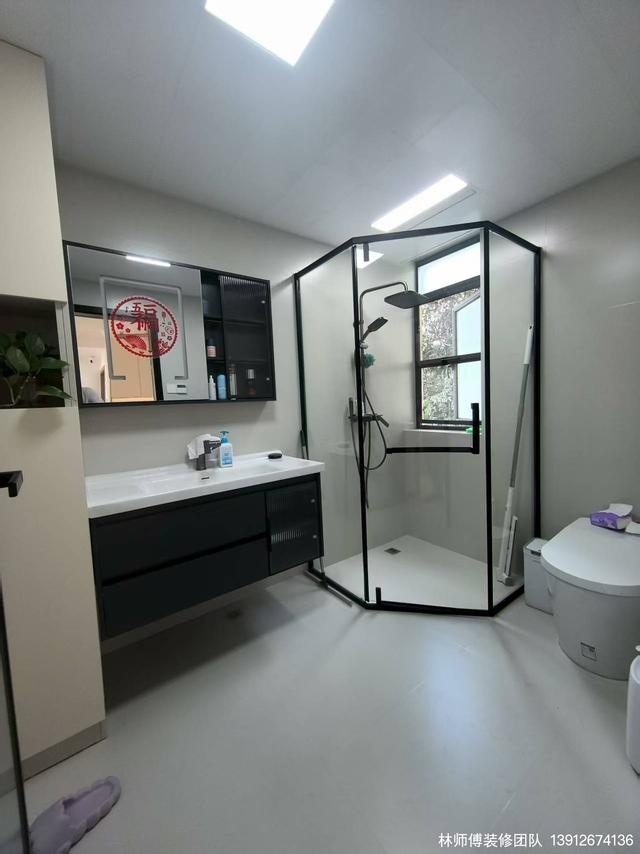 卫生间做了干湿分离设计,安装了钻石形淋浴房,占地面积小,洗澡时水不会溅到外面。洗漱区装了镜面柜,护肤品、牙具等都能藏在里面,台面干净整洁。整个卫生间看起来清爽有序,使用起来也更方便卫生。
