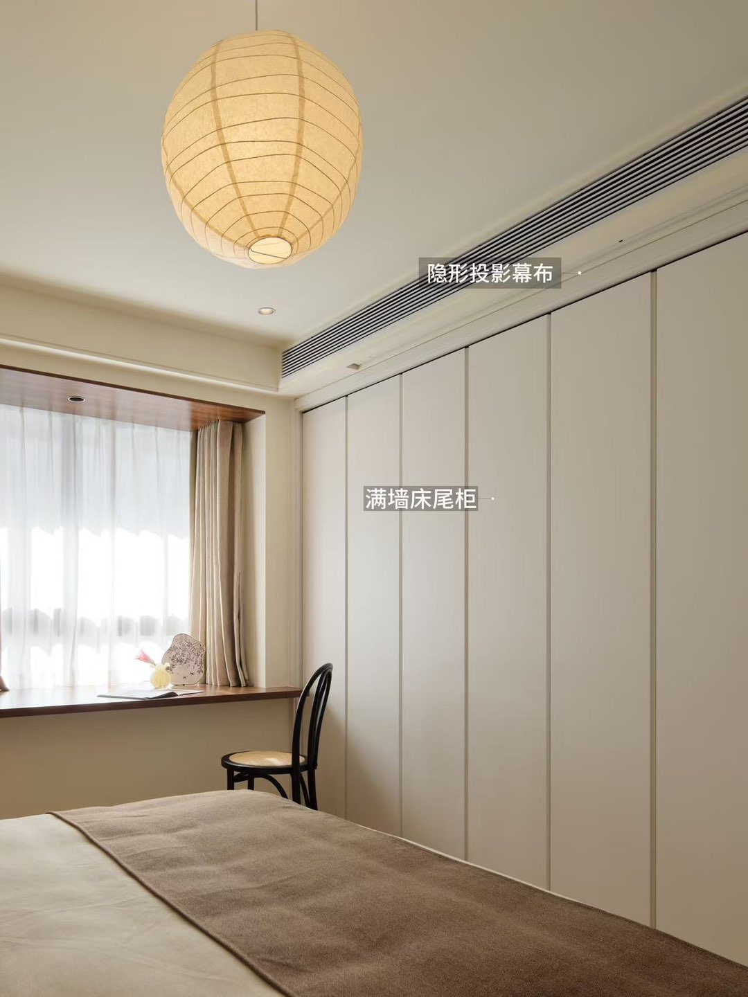 主卧两排满墙收纳柜可足了,满足观影需求+床尾柜收纳两不误