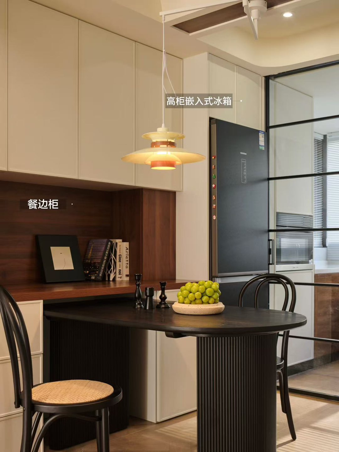 餐厨区的收纳柜“小心机”真的太多了,嵌入式冰箱高柜在移门敞开的时候,与厨房高柜一体化,视觉效果太绝了
