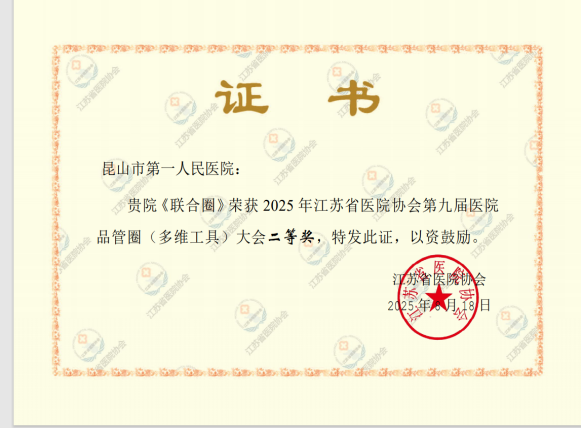 近日,在2025年江苏省医院协会第九届医院品管圈(多维工具)大会上,昆山市第一人民医院《联合圈》在全省600余个参赛圈中脱颖而出,荣获二等奖!
