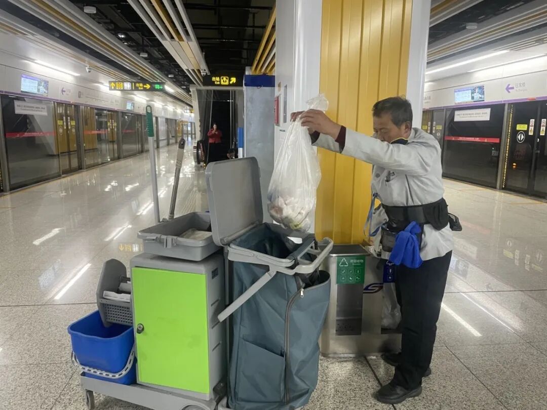 保洁员:跨年夜人潮散去后,保洁师傅们推着清洁车清扫站厅和车厢,蹲下身擦干净地面污渍,及时清运垃圾,赶在早高峰前把车站整理干净。