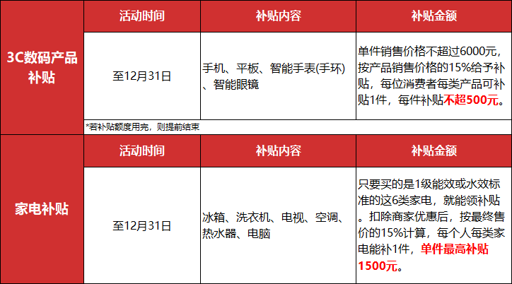 ✅ 补贴标准:单件销售价格不超过6000元,按产品销售价格的15%给予补贴,每位消费者每类产品可补贴1件,每件补贴不超过500元。