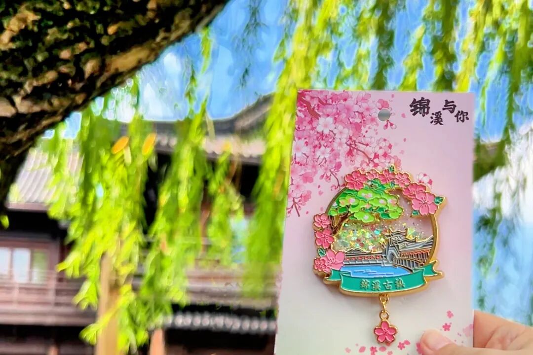 近年来,锦溪镇始终以活化本土文脉、赋能文旅发展为导向,将文创开发作为推动古镇从静态保护向动态焕新转型的重要抓手。跨界融合类产品积极承载地域文化,侯北人美术馆联名咖啡将名家画作“印”入杯身,让艺术与日常消费实现创意联动。地标衍生类产品亮点纷呈,流沙冰箱贴轻轻晃动间,彩色亮片如溪水般在桃花间流淌,生动还原《陈墓镇志》中“一溪穿镇而过,夹岸桃李纷披”的诗意画卷;古莲桥文创雪糕以浮雕工艺复刻飞檐黛瓦与荷塘盛景,清甜奶香裹挟着江南韵味,成为游客打卡必备的“味觉记忆”。IP赋能类产品萌趣十足,以文昌阁和古莲桥为灵感打造的“小锦”“小溪”卡通形象,衍生出钥匙扣、摆台及微信表情包等系列周边,让古镇文化以更鲜活的姿态贴近大众。主题礼盒类产品精准对接市场需求,高考祈福礼盒融入文昌阁、祝甸砖窑文化馆等本土元素,寄托“金榜题名”的美好期许,成为游客馈赠亲友的佳品。
