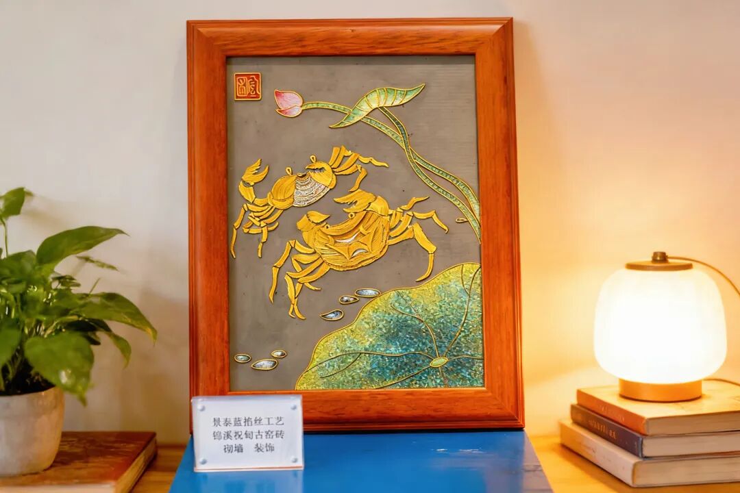 锦溪素有“七十二只窑”的美称,这里窑业发达,从元代开始就盛产砖瓦。除了传统青砖之外,明清时期就开始承担着为皇宫供奉金砖的任务。2016年,锦溪古砖瓦制作技艺入选省级非物质文化遗产名录。如今走进锦溪,祝甸村还留存着成片的古窑群遗址,明镜荡畔窑火依旧熊熊,非遗匠人坚守古法技艺,让古砖瓦制作成为“活态”传承的文化瑰宝。此次热销的掐丝画,突破性实现两大非遗技艺的跨界碰撞:精选当地窑口烧制的砖瓦为底坯,砖体质地致密如墨玉。同时,特邀非遗传承人先手绘锦溪风光草图,复写至砖瓦底板,然后以金属丝勾勒图案轮廓,以天然矿物釉料填充“点蓝”,色彩过渡需精准控制,确保画面层次分明,最终成为一件件兼具艺术美感与文化底蕴的匠心之作。