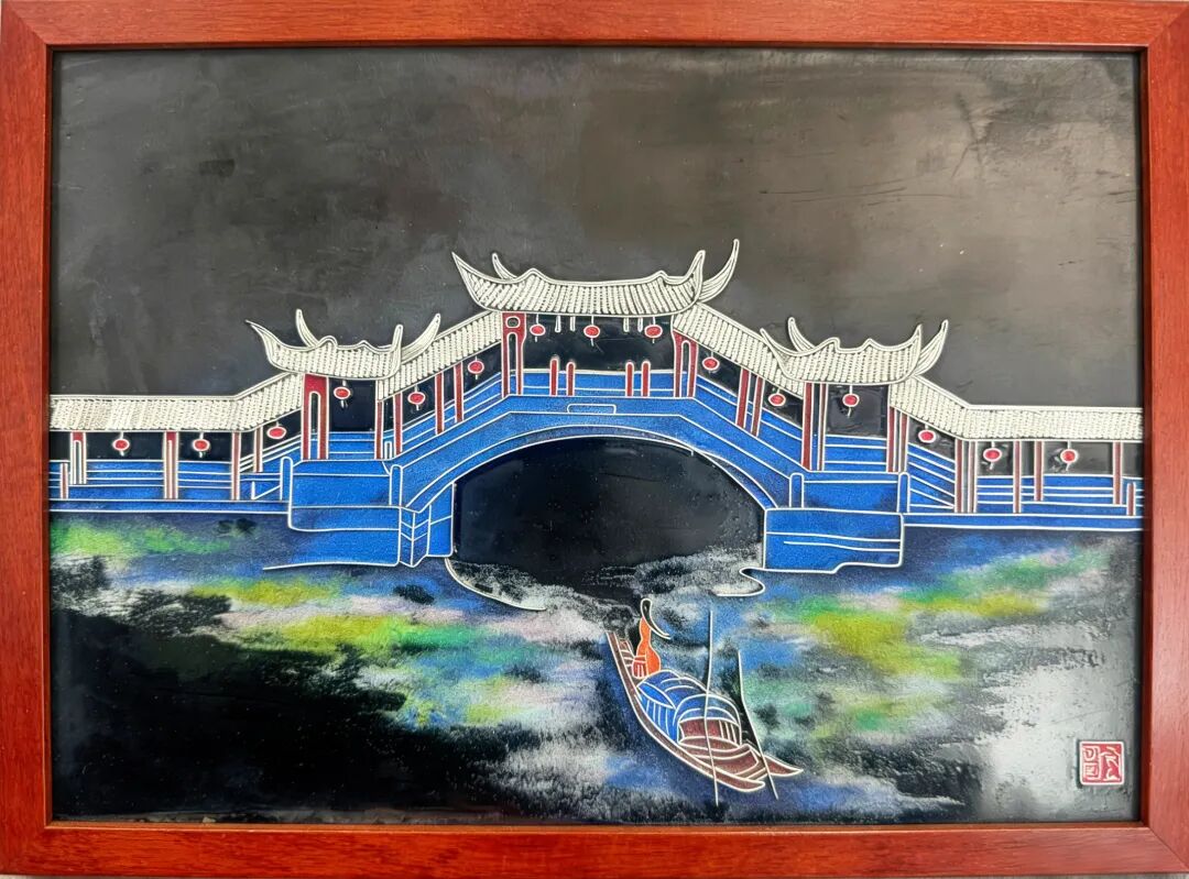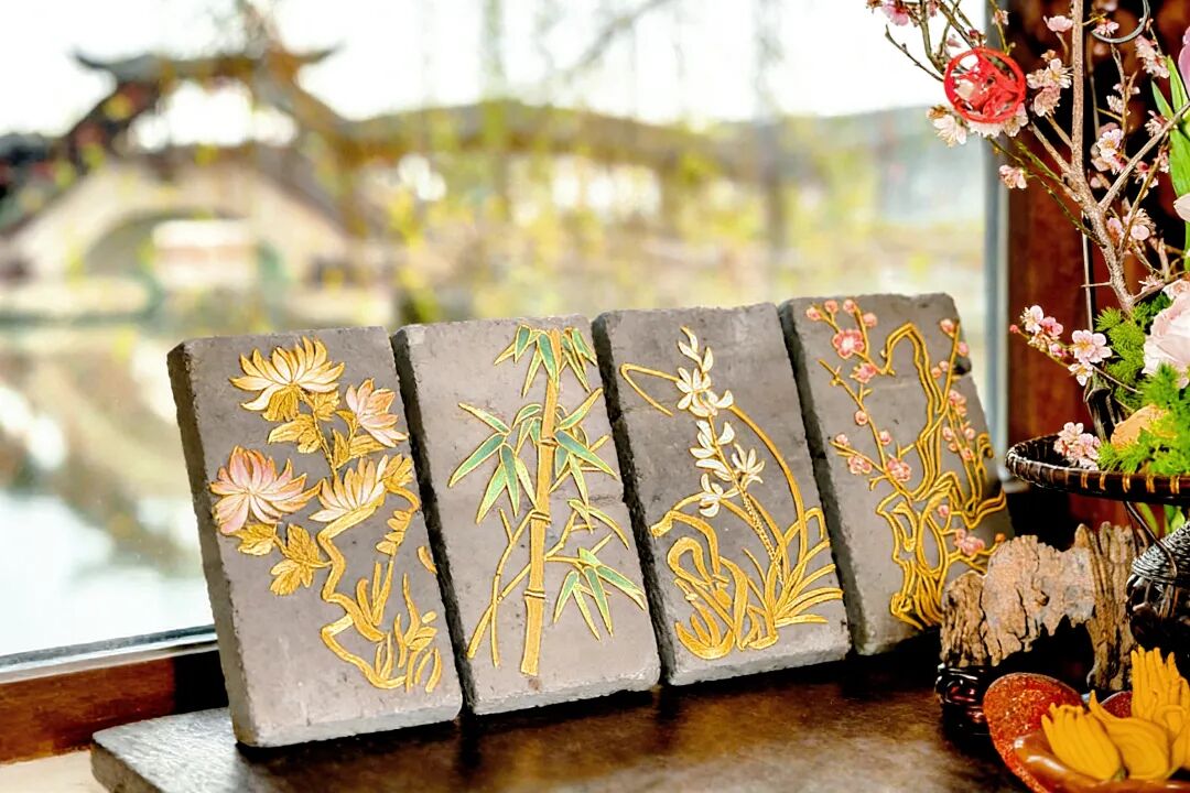 春节期间,锦溪镇一系列以青砖为基底、融合千年掐丝珐琅工艺的景泰蓝掐丝画,因独具匠心的工艺和吉祥如意的寓意,吸引大量游客购买。青砖加以细腻的掐丝勾勒与珐琅彩绘,使古莲桥的婉约风姿和“梅兰竹菊”的传统美学符号凝于方寸之上,再现江南水乡的诗意画卷。这不仅为游客打造了把锦溪记忆带回家的独特载体,更彰显了锦溪镇以文创活化千年文脉的创新实践,让非遗技艺焕发新生,让传统文化融入现代生活。
