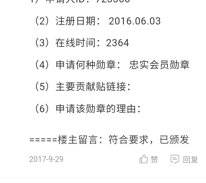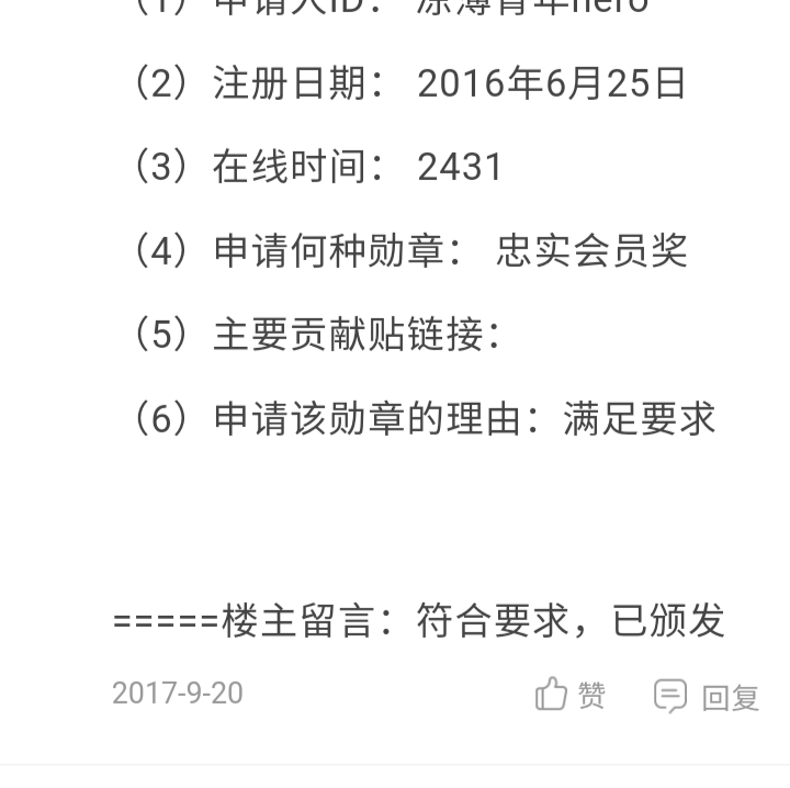 雪玉尧儿:1、申请人ID:雪玉尧儿2、注册日期:2019.6.123、申请何种勋章:忠实会员奖 eA Fp<2g ....... (2020-08-09 22:40) w7pX]<?R"