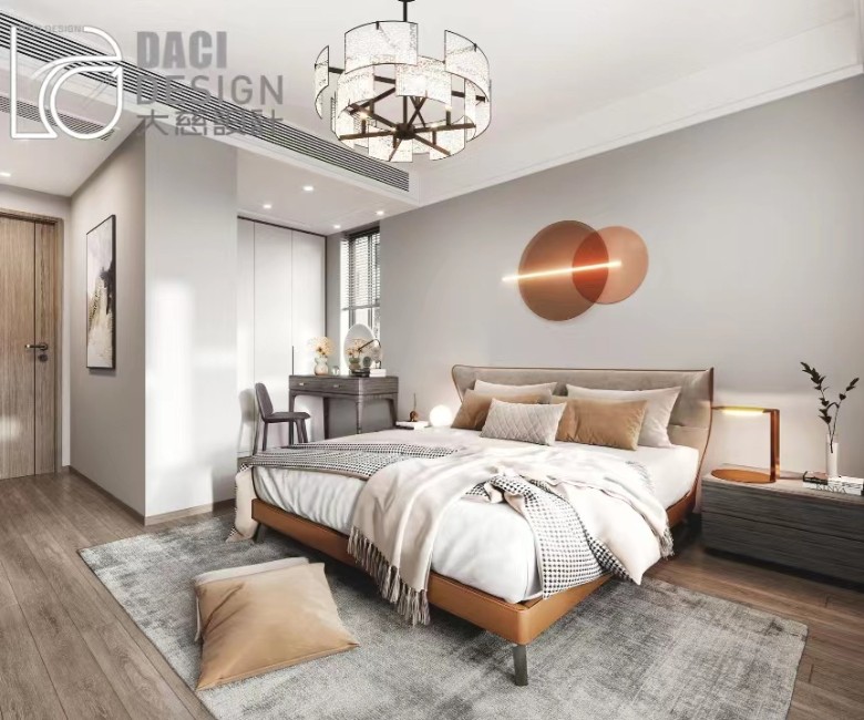 主卧宽大的床上铺着灰色、棕色的床上用品,伦敦雾色的床头背景墙用设计精巧的线性吊灯进行装饰,柜子上摆放着画作和花瓶,屋顶做了简单的吊顶,既起到了很好的装饰作用,又没有占用太多的空间,主卧整体给人一种舒适的感觉。
