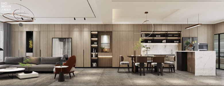 转入即可见细心的布局,公区不需要太多的颜色,以黑白灰为基调,低饱和度的小色块点缀,沙发背靠大面落地景观窗,自动窗帘缓缓拉开,感受阳光洒落进房屋的舒适惬意。木色沙发墙配合暗藏灯带达成见光不见灯的高级感,太阳下山后,隐隐的灯光均匀探出,舒适格调不彰自显。延伸感、灯光、材质、形态过渡层面都经过精心拿捏,增添其细节之处的魅力。