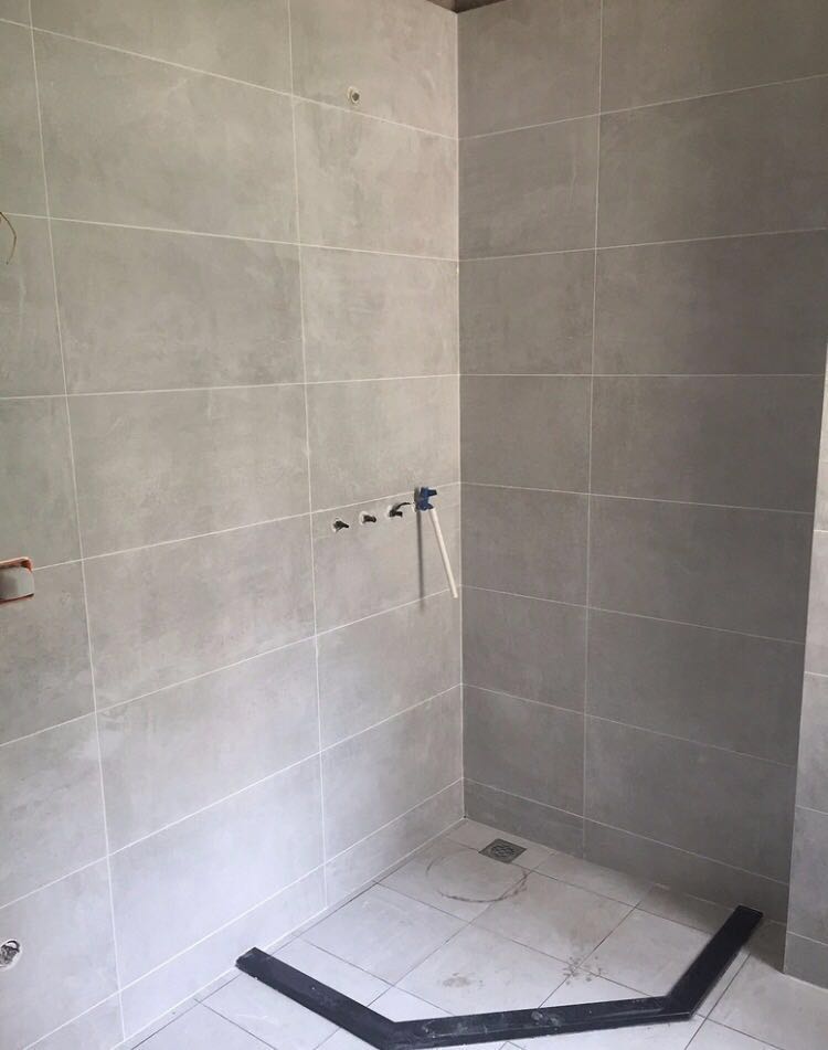 厨房地砖是浅灰色仿古砖,墙砖是白色瓷片 跃上卫生间铺设效果,墙砖勾缝用的白色,所有地砖用的是黑色勾缝剂