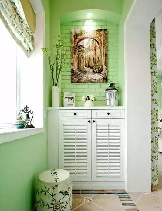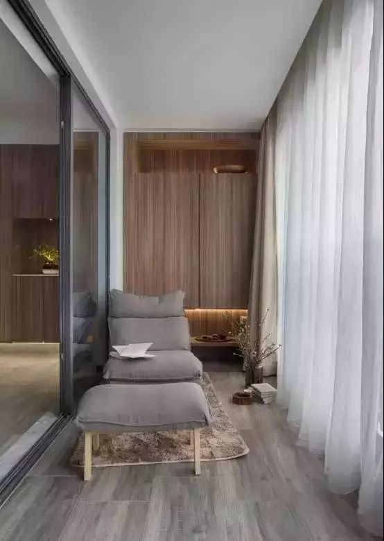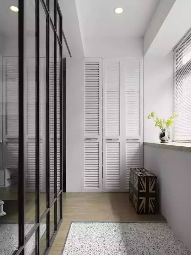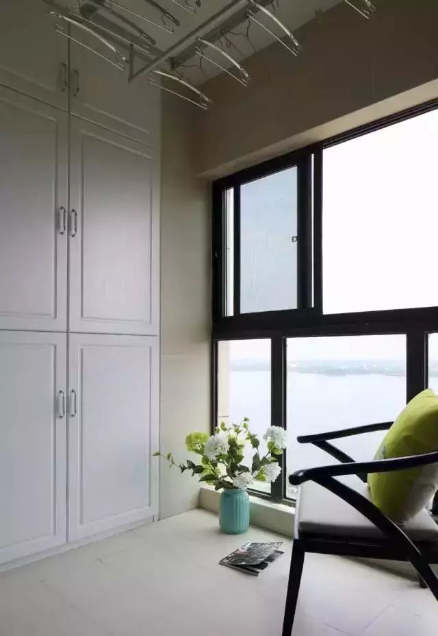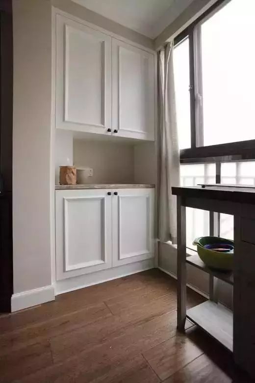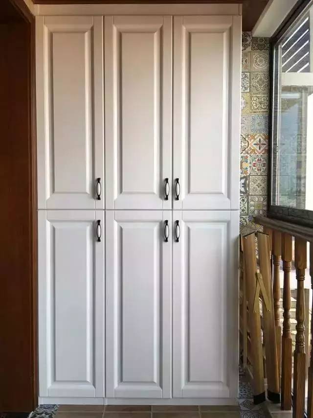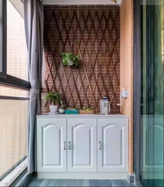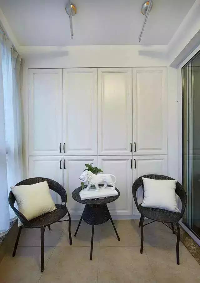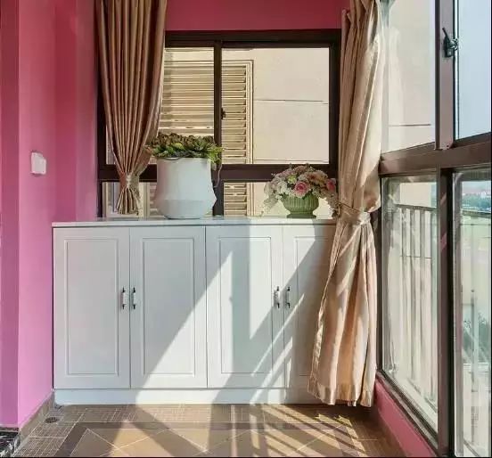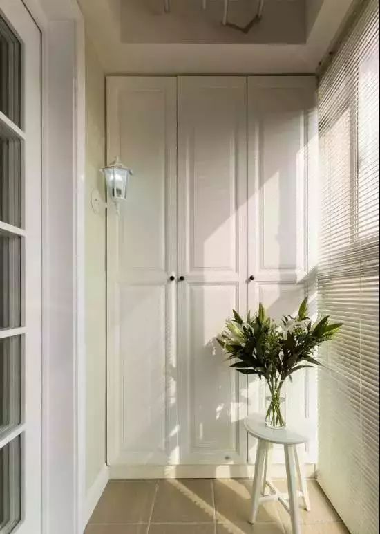 当然,如果你愿意,还可以做一整面墙的收纳柜,看起来会更大气一些,这种阳台柜子,最适合放棉被、过季的衣物等易潮易发霉的杂物,通风阳光都满足,不易潮湿。另外,如果玄关比较小,放不了几双鞋的话,把鞋放阳台柜也不错。