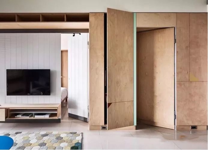 可以把卫生间的门设计成“隐形”的,隐形门的特性就是“隐藏”的功能特别强,不认真一点都找不到卫生间在哪吧!