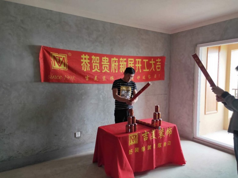 签约1周后,在5/18号良辰吉日开工。开工现场准备了红色门套、桌布、礼炮、鞭炮。