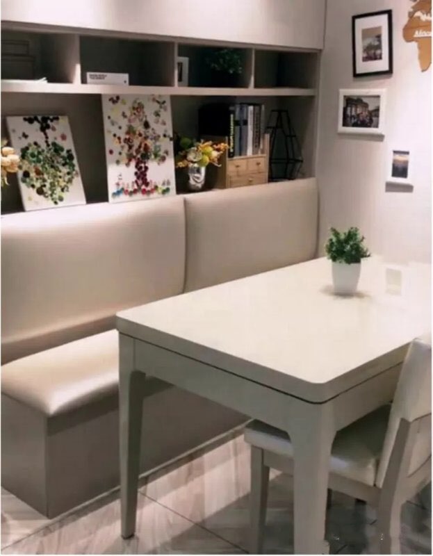 餐厅卡座设计,还可以方便熊孩子孩子爬来爬去,打开靠背坐垫下面就是柜子都是可以储物的。整片墙可以做照片墙把你与家人的温馨瞬间都记录在墙上,满满的幸福感。如果你是个文艺青年就可以做一个个大书柜,即使餐厅又是阅读区,餐桌可以选择折叠超长的,想坐多少人都可以。