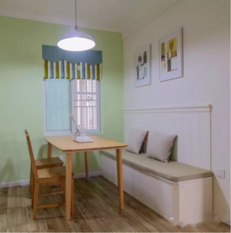 餐厅的装修设计并不是一张餐桌,加四把椅子等于餐厅?现在的年轻人才不会喜欢这样的设计,扔掉传统的餐厅设计,利用拐角做两排餐厅卡座,家里来多少朋友都能坐的下!卡座底部可以设计成储物柜,卡座的设计既能省掉四把椅子,空间又多出两平米收纳空间,又能展现个性又实用!