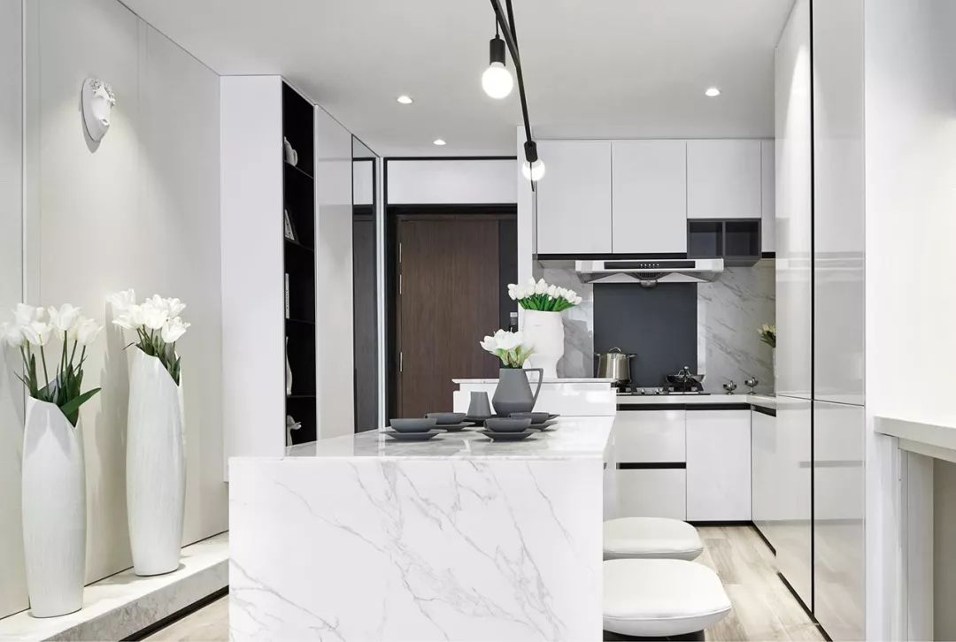 开放式岛台餐桌以白色大理石为基调,在光线的调和下呈现出通透明亮的气质。为了避免视线遮挡,我们用矮凳代替靠背餐椅,让观者的视野在进门时便穿透整个区域。
