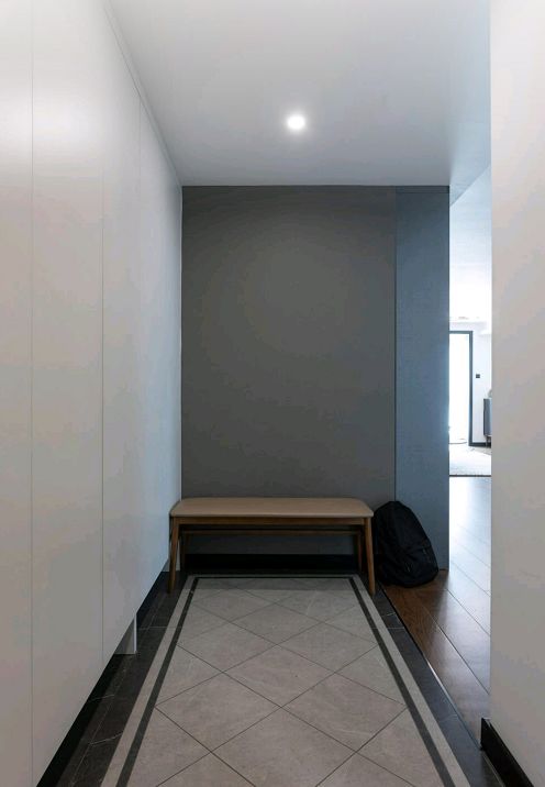 ▲入户玄关走廊处做了到顶的鞋柜,鞋柜的底部留空,方便摆放日常更换的鞋子。换鞋凳放在玄关的尽头,让玄关不会太过拥挤。