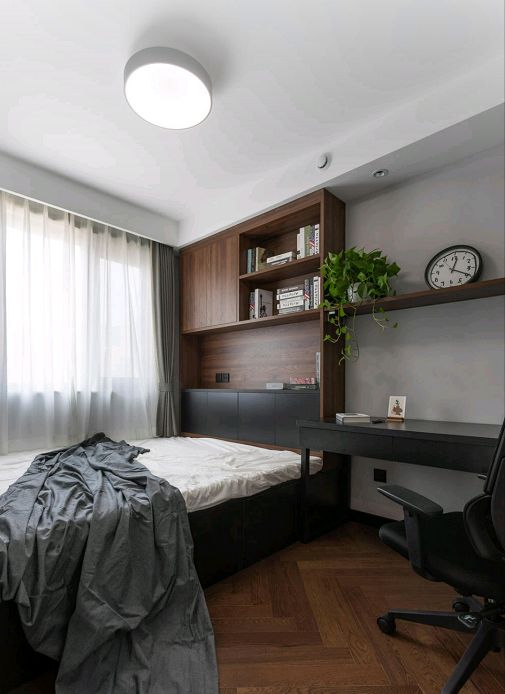 ▲还有一间卧室是作为书房和备用客房来设计的,榻榻米床组合衣柜和书桌柜,既方便了屋主工作和学,又能满足休憩和收纳的需求。