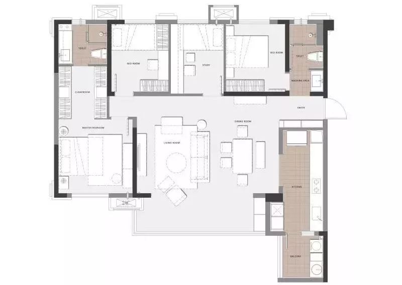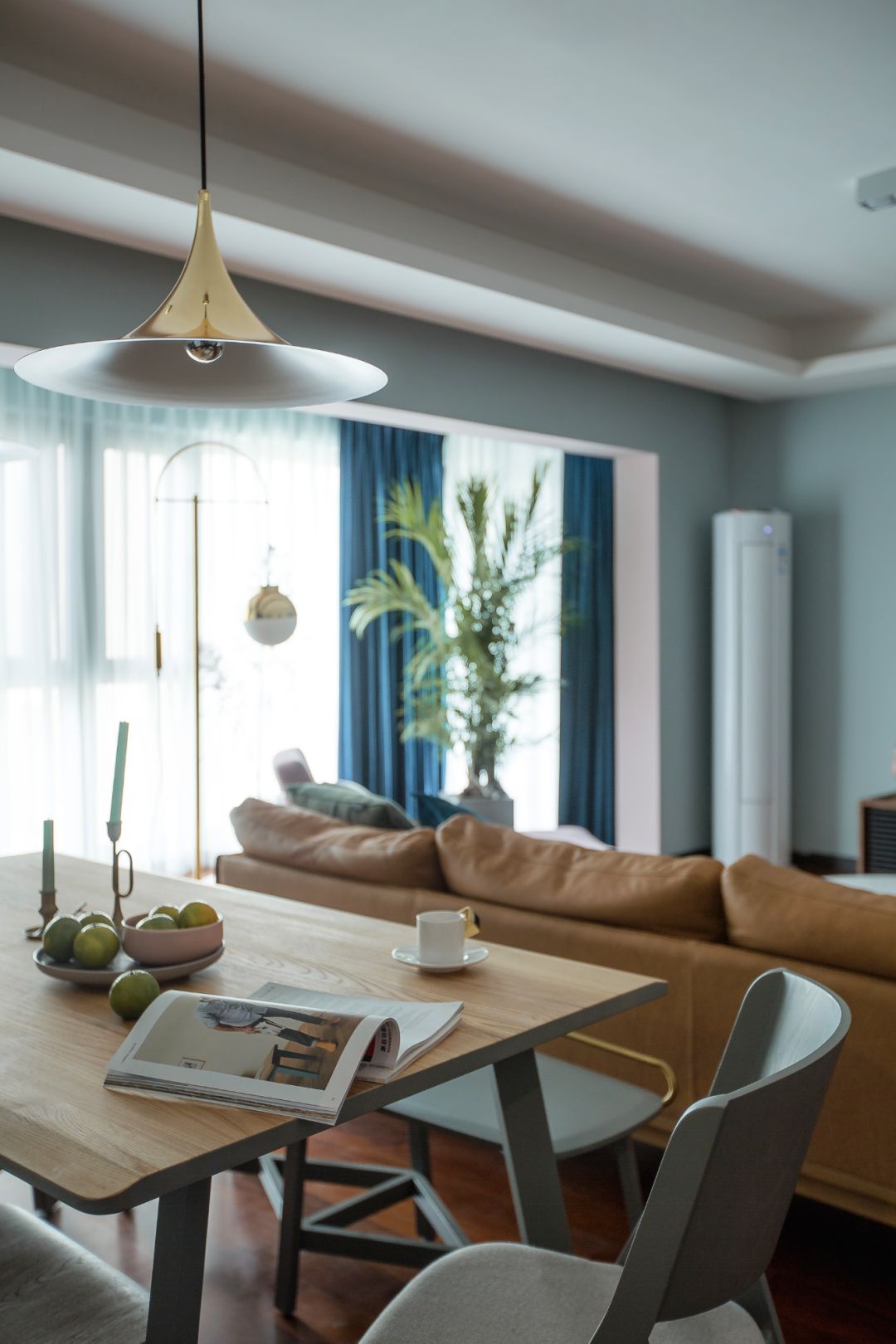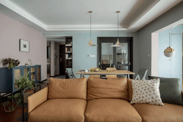 整个空间采用柔美的脏粉,与绿色、灰色、蓝色与金色巧妙地融合在一起,打造出丰富的色彩层次与多姿明朗的视觉观感。客餐厅以沙发做为分隔,横厅的布局,采光更好,动线也更加流畅。棕色的皮质沙发,舒适且有一种怀旧的质感。