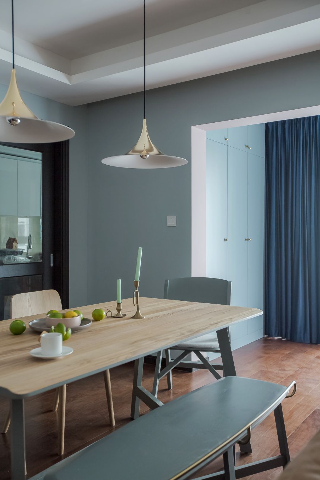 餐桌的白蜡木,有着自然的纹理,手感质地温润,这里除了用餐,也可以是阅读、喝茶的地方。灰蓝色的窗帘与家具相呼应,让空间的配色更加和谐统一。