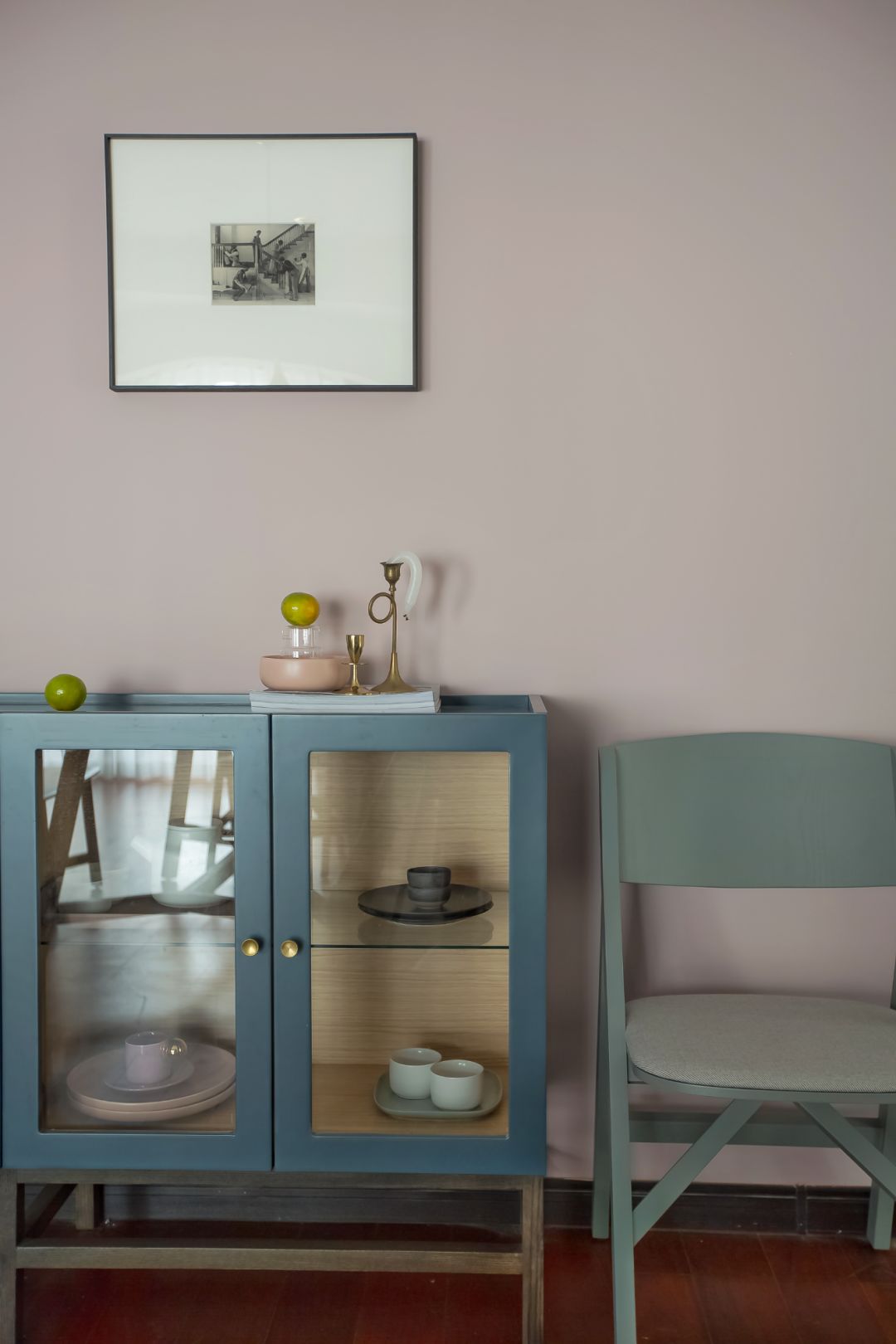 餐边柜是透光玻璃柜门,拓展了视觉空间的同时,让屋主收藏的器物更具展示性。