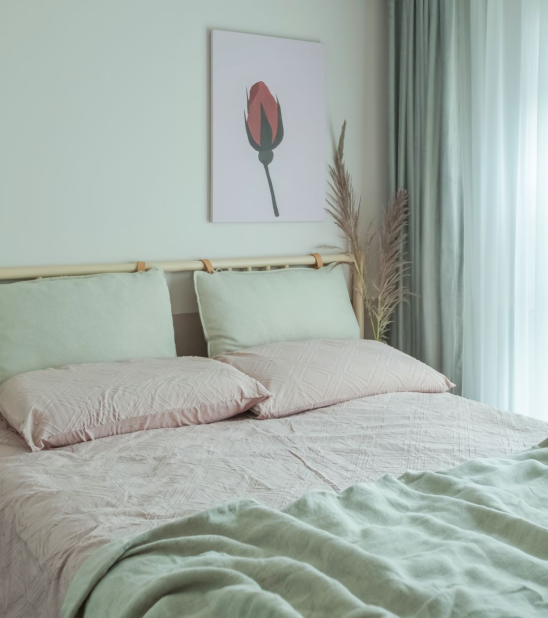 脏粉色的墙裙,床上用品,还有淡蓝色的衣柜柜门,这也是公共区域的调性,柔美清新。