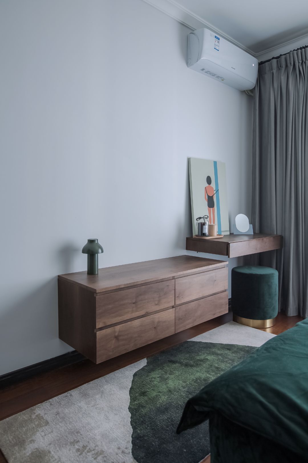 利用床尾的宽度设计了女主人想要的梳妆台,同时又加入一组挂壁抽屉,增强空间的收纳性,又便于打理,柜体选用了胡桃木材质,搭配墨绿色空间散发出一丝复古气息。