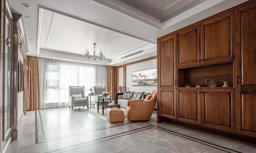 在另一侧的客厅空间内,皮艺沙发和中式风的硬装造型结合,色彩也是相互呼应的,整体感非常强,看起来就显得非常的高档。