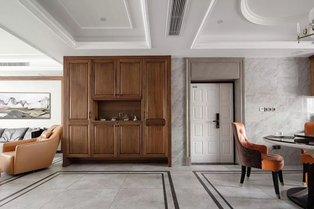 入户没有玄关走廊的户型,利用客餐厅之间的过道做了嵌入式的柜子,棕木色的柜子和大理石瓷砖结合起来,带来别样的大气感受。