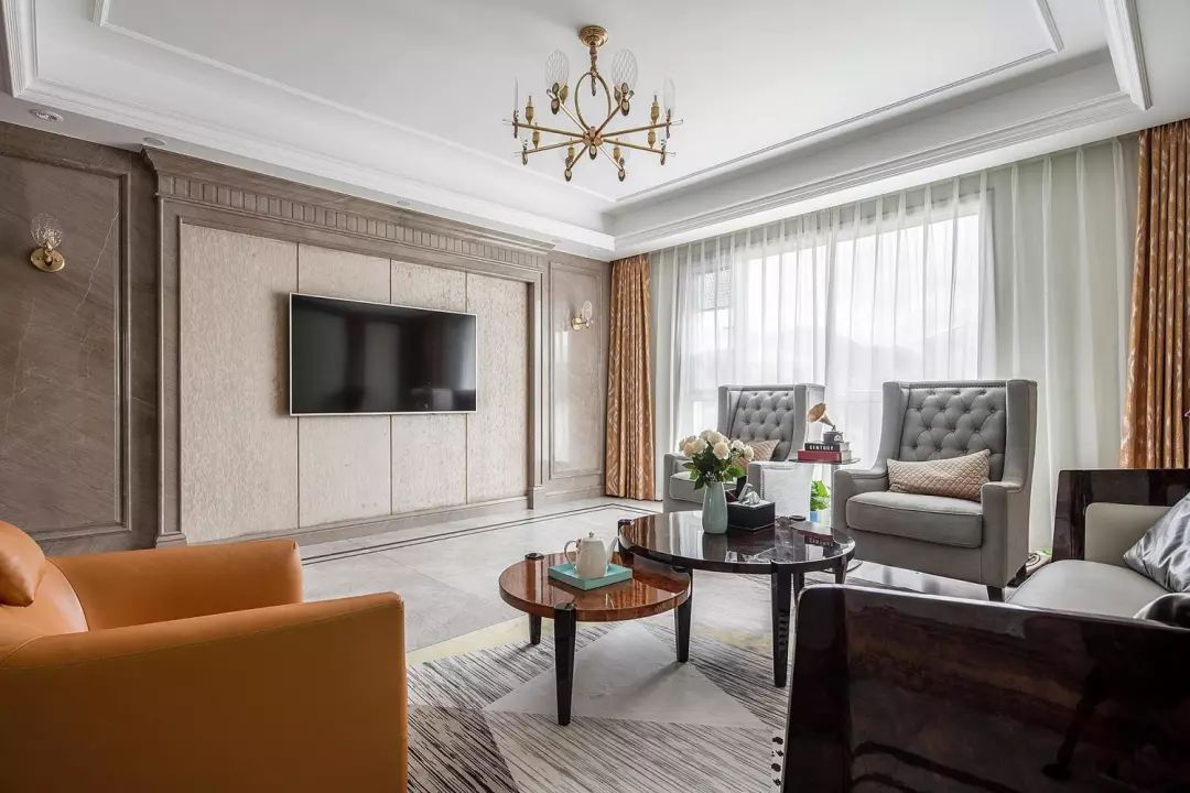 电视背景墙做了罗马柱边框的造型,中间是硬包饰面板,灰色大理石延伸到两侧形成对称的布置,带来一种低调的高级感。