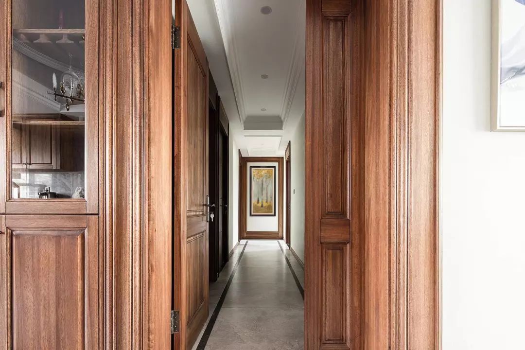 通往卧室的走廊和玄关门正对,为了避免风水问题,所以加装了一扇门,给地砖加上了波导线的设计,显得更加的端庄和大气。