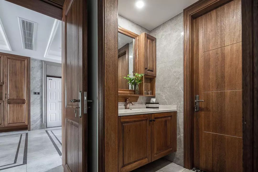 卫生间干湿分离,把洗手台给放在了门外,而且同样运用了做旧款的木质氛围,和其他空间能够搭配起来,显得更加宁静。