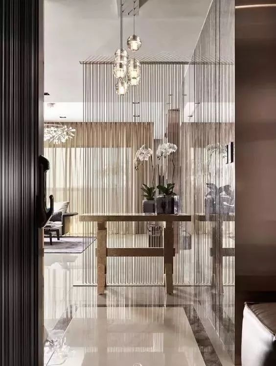 线艺隔断是采用线条的延展性,既分割空间,又不将空间完全隔开,隔中有连接,断中有连续,虚实结合。线艺隔断可以采用不同的材质,如金属、绳子等,将若隐若现的朦胧美含蓄优雅的呈现!