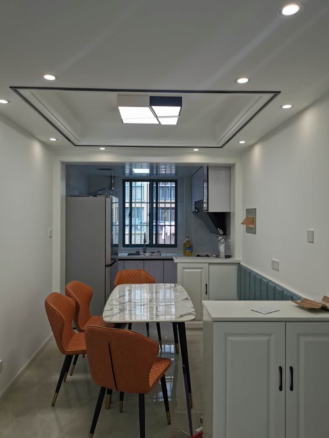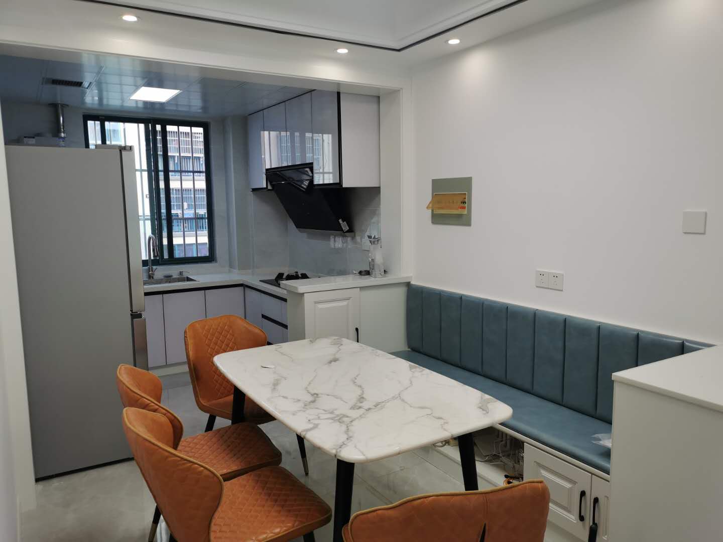 ▲开放式厨房设计,用一个矮柜隔开厨房和餐厅两个空间。餐厅做了卡座,既节省了空间,也增加了储物能力。小户型业主可以参考!不管是厨房还是餐厅都以白色为主,色彩单一,所以在选择桌椅的时候,用了颜色比较鲜艳的橙色,丰富了这个空间。