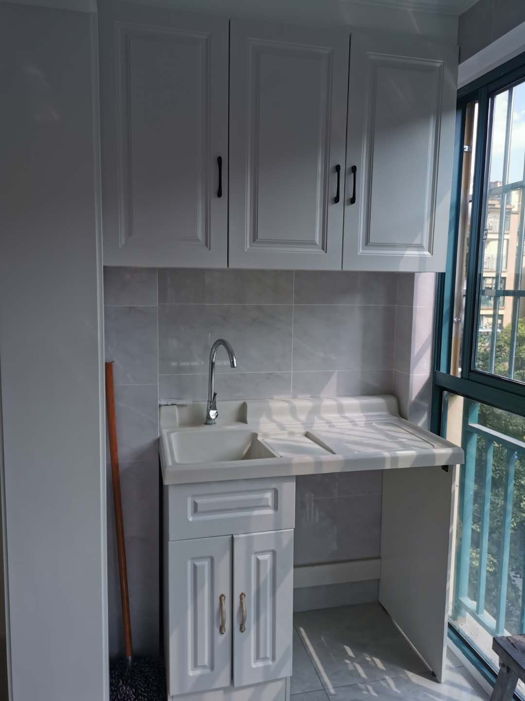 ▲阳台主要的功能是用来晾晒,下面放滚筒洗衣机,上面是水池,顶上做了吊柜储物。