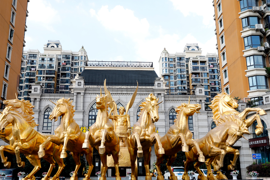 八匹腾飞的金色骏马,恢弘大气的社区入口;三进式入户礼制,实现礼序归家;欧洲景观园林对称式布局,融合建筑与景致,四季植被高低搭配,景随人移、步移景异。