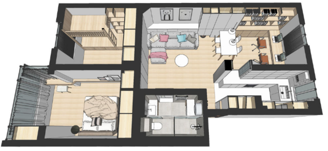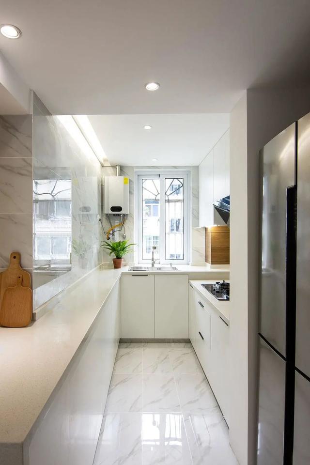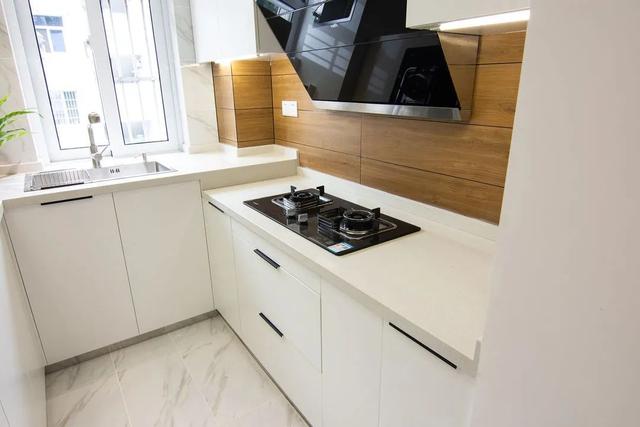 改造后的厨房,厨房和玄关连通之后变得宽敞许多。由于操作空间不足,左侧设计了一道宽35cm台面,用于摆放厨房电器和其他物品,下方又可以收纳。高低操作台设计更符合人体工程学,提高了日常烹饪舒适性。灶台上方除了油烟机外,还设计了吊柜保证充足的收纳。