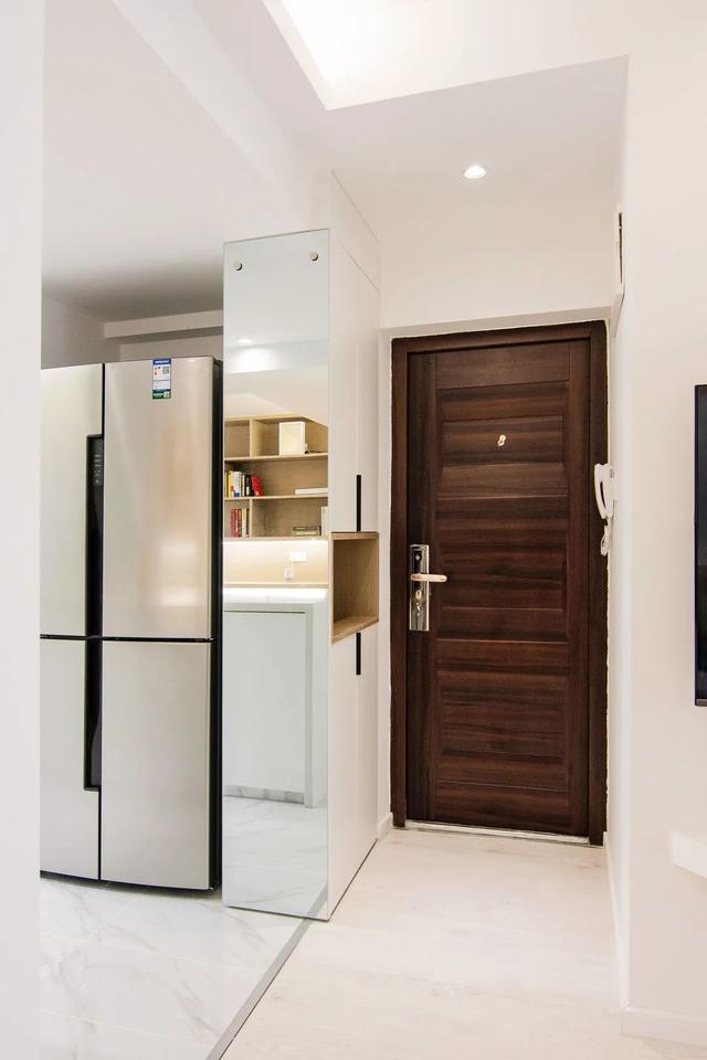 改造后的玄关,利用空间结构新增了隔断鞋柜,提高玄关收纳能力保持空间整洁。鞋柜侧面一面全身镜,满足日常整理着装,同时也有着放大空间的作用。拆除原有吊柜和石膏线,局部吊顶拉高层高,筒灯和灯带设计提供照明,让玄关更加明亮。