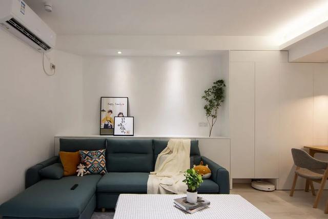 改造后的客厅,空间打通之后,空间更显宽敞。布艺沙发取代了原来的木家具,更加的舒适实用。调整了空间安装位置,设计了一排储物柜,提高客餐厅收纳,让空间更加整洁。沙发背后的矮柜,用于存放不常用的物件,柜子进深延伸了空间感,台面又可以摆放绿植、装饰画和充电器等。