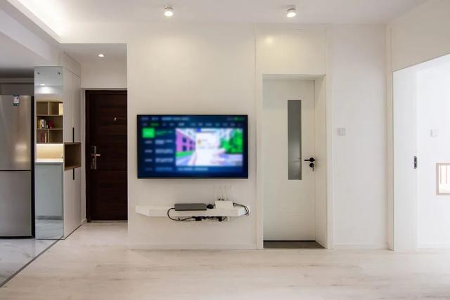 为了居家动线的流畅,舍弃了电视柜直接安装隔板架,简单实用节省空间。电视墙不做任何造型,简简单单的一面墙,省钱又耐看。为了视觉上的统一效果,房门做成通高的门头。