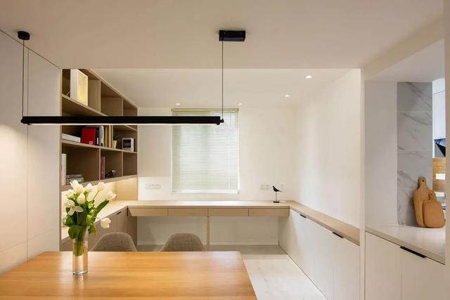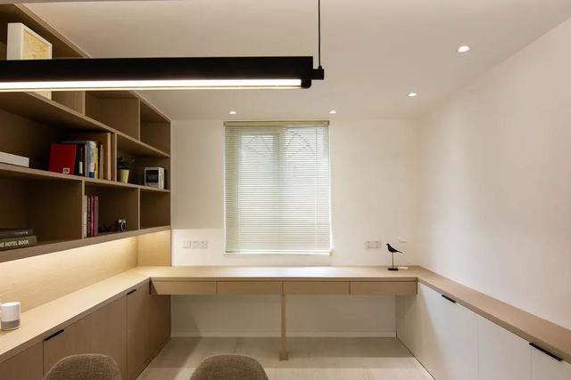 改造后的书房,将空间打通后,一改之前狭小拥挤变得宽敞舒适。一圈木饰台面将空间连接起来,靠窗设计工作台,可以同时满足两人办公需求。左右两侧均设计了储物柜,虽然进深不足,但也可以收藏一些小物件。吊柜设计充分利用台面上放空间,用于摆放书籍和手工模型,这样就不需要占用空间摆放书柜了。
